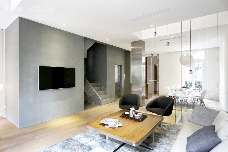 排屋是个很有意思的东西:以为房子再大,在某一时刻你都只会呆在其中的一个房间里——也就是说你花了几百万买了一个300平方米的排屋,却永远都只会呆在一个二、三十平方米的客厅、卧室或者餐厅。为什么会这样呢?其实是因为墙和楼板的存在阻碍了你真正拥有一个感受的到的300平方米房子。所以这个设计引入了“大居室”的设计理念:在这个一整层的居室中有餐厅、有客厅、有吧台、有起居室,甚至有卧室,而这些空间之间没有任何的墙进行划分。所以你会看到一层的客厅与餐厅整体形成了一个开放的公共空间;二层的老人房与儿童房之间用落地玻璃取代了墙,让老人和儿童其乐融融的共享一个通透、明亮的空间,彼此可以看到对方、同时窗帘又保证了相互之间的私密性;三层的主卧室与更衣室形成了一个南北通透的大局室、四层的大孩房独享一个不被打扰的叛逆空间。