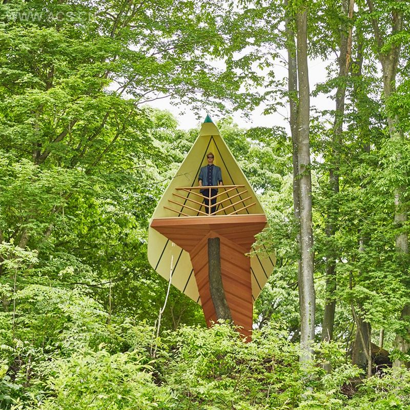 树屋的施工是由20名日本工匠组成的团队完成,结构自身已构成了鸟的形状,工匠们在轻松的工作环境中将设计师的纸上构想变成了真实的三维空间。图形元素对于他作品中的视觉故事性非常重要,建筑形式转变成环境,在这里访客通过视觉上和作为一个观景的房子与建筑进行互动。