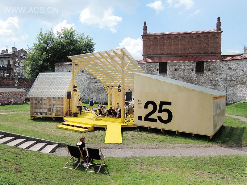 第25周年犹太文化节纪念活动在克拉科夫的卡齐米犹太区庆祝,全世界各地的犹太人都汇聚到此处。BudCud需要在活动广场中设计了一个临时的公共空间,遗憾的是,公共广场被汽车,活动,还有商业行为所占领,为此设计场地移到了犹太教堂后面安静的Dajwor街,临时建筑就在草坡上搭建起来,占据着这个秘密花园。