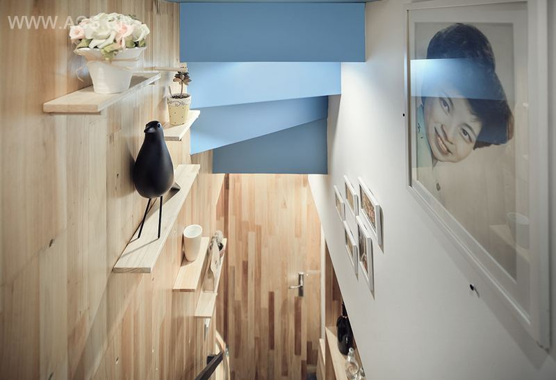 “挤压”,即这个错层的建立,让原本聚集一起没有隐私的空间打散成一个个独立的空间。每个房间的私密性得到了保证。但这还不够,建筑师希望有在不同房间之间“跋涉”过程中,能有室内室外空间交替的感觉,并对此做了强化。比如楼道中的红枫叶墙,结合红枫叶墙设计的天窗,天窗下正对的鱼缸以及儿童房的凸窗⋯都让人感觉你并不是居住在一个密闭的室内,而是居住在由室外环境串联起的一个个小的房屋里面。
