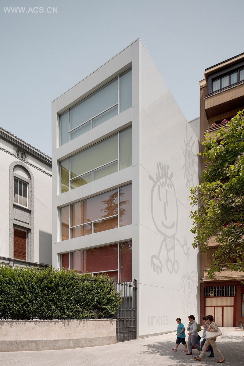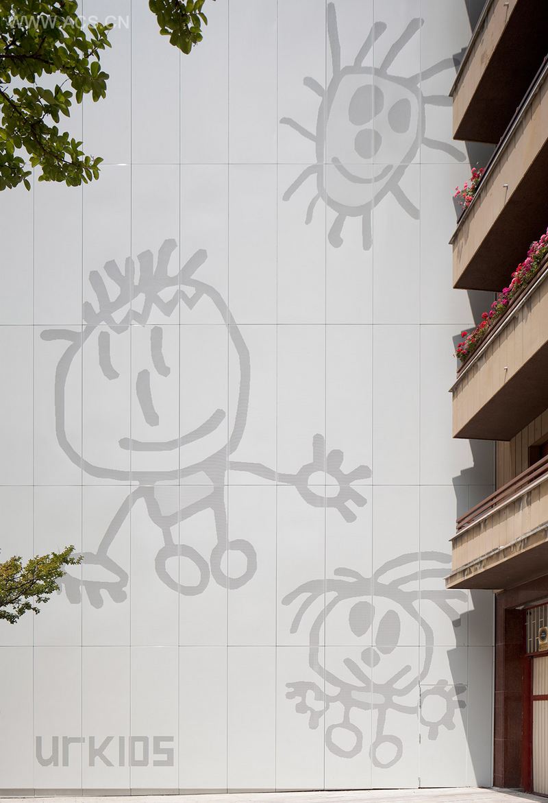 UrKids幼儿学校是一栋极为细长的白色5层高楼。建筑师将入口设置在了建筑长边的中心。建筑仅从两个短边采光,两个长边全为封闭式,其中东面长边采用了穿孔通风铝板幕墙,幕墙的图案来自一个三岁孩子的创作。建筑的短边采光面每一层都配有不同色彩的窗帘,当窗帘拉下来,建筑显现出五彩屏幕般的外观。