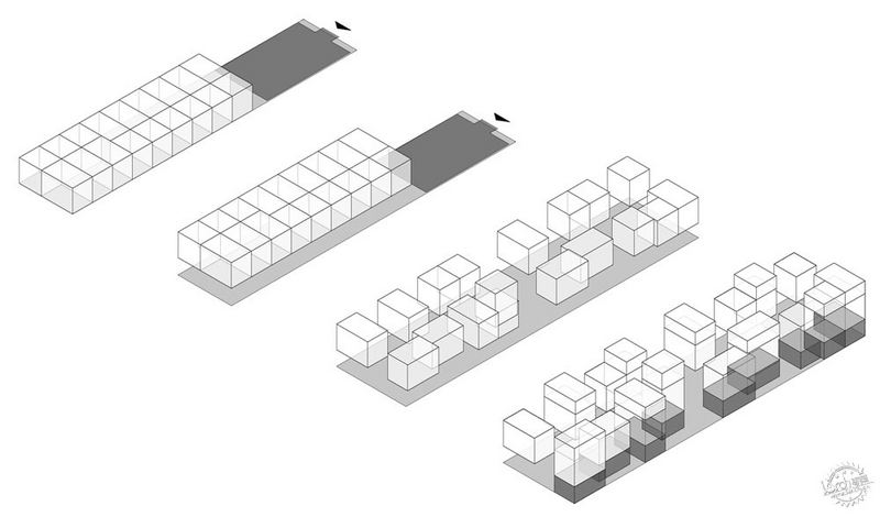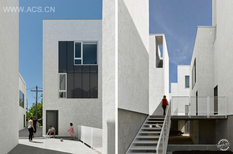 该立方体建筑外立面是简洁的白色灰泥以便反射光线进入广场,并与邻近的建筑物提供了一个现代化的搭配。除了简化施工过程,公寓的垂直设计也使户外设施沿着人行道边,结合绿地,小庭院和入口处的口袋商业套房而设计,为居民的生活、工作提供了更多的空间。