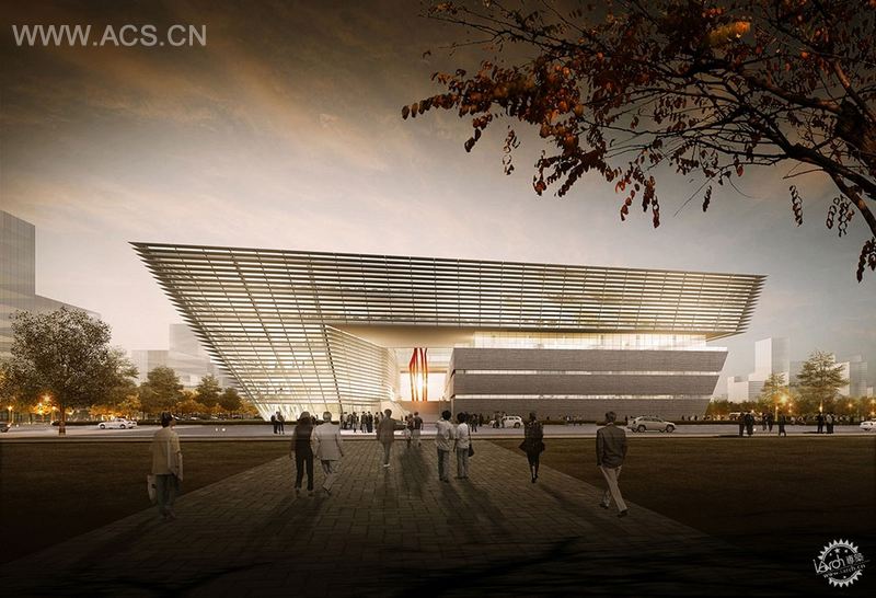 这座42000平方米的建筑综合体外墙设有水平铝百叶覆盖的玻璃幕墙,形成一个如同堆置的书籍般的建筑体块。相比之下,地上的储存设施,外观较为不透明,与建筑物的其余部分相隔一个凹玻璃幕墙及其周边露台组成的楼层。在地面上,该建筑的堆叠和倾斜的形式也创建出一个中央广场,这有助于明确划分空间,以及划定建筑物的多个入口的功能。