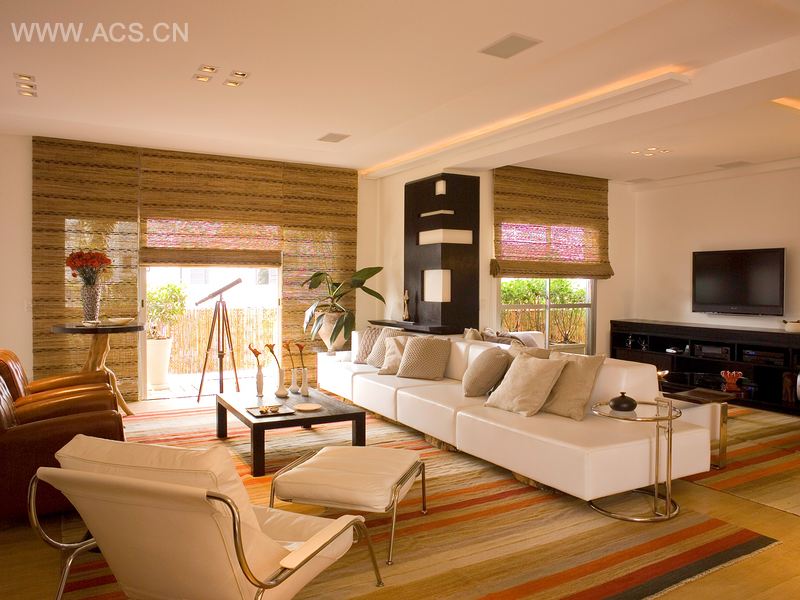 地面铺着磨损的木地板和东方的现代地毯。大大的皮质沙发压在地毯上。黄色的草杆编织窗帘控制光线的大小。椅子边摆放着柠檬色的树干艺术品。咖啡桌是一个已有50年历史的美式玻璃收藏品。
