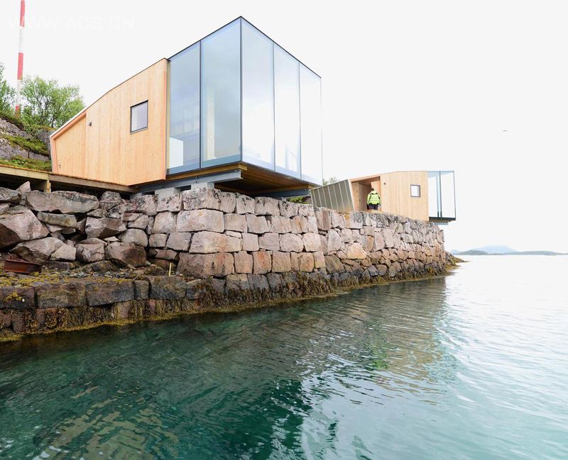 The interior gives room to a professional kitchen and dining area on the ground floor and a relaxing library on the first floor. The cabins are all but one placed on the stone quays, partially cantilevered above the sea, one placed on a natural shelf on the rocky formations above . The positioning and orientation of all the cabins is d on the consideration of their individual panoramic views and privacy for the guests.
