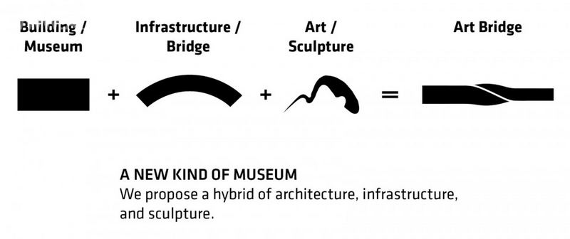 BIG的提案是一根造型简洁的梁,横跨在Randselva河上,成为雕塑公园内的第二座桥梁。建筑体量中有一处扭转,使得建筑得以从公园南部低洼的林区自然地过渡至北部的丘陵地带。同时这一设计创造了一系列互相连通的空间:媒体、绘画、雕塑展厅由北向南垂直叠加在一起;而水平方向上,由南向北是开放的用于展览雕塑和大型装置的画廊空间。