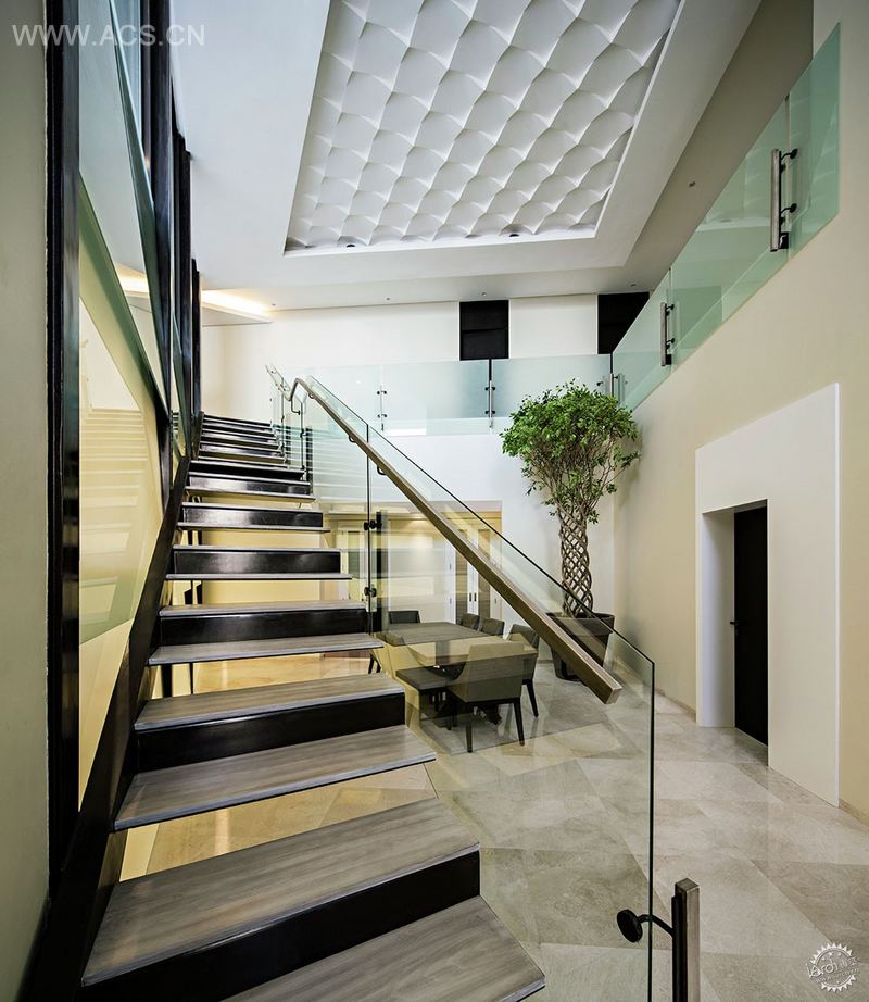 它的核心之处是,盒子房子有庭院式的布局设计,居住在一边,休息区在另一边。庭院放置在二层。设计沿着对角线分解,分为一个巨大的户外平台和室内有着突出楼梯的两层高的公共空间。
