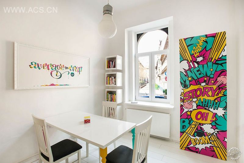 作为流行文化在美国应用艺术及广告业演变中的角色的代表,漫画贯穿了整个工作室设计。在每个房间也有连接房间功能的漫画插图。在会议室里用来隐藏锅炉的橱柜上满是单词BOOM,在那里发生着故事,主要词语就是故事,而放置了巧克力的小桌子正是这一点的集中体现 。