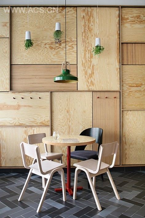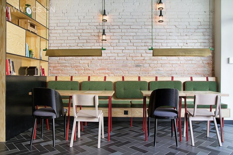 PB/STUDIO 为波兰格丁尼亚的汽车流动餐厅—Carmnik Kantyna,设计了第一座固定场所餐厅。这座固定场所餐厅不仅体现了品牌的特征,还植入了相当多的新鲜要素。大量的松木胶合板以方块的形式组合运用在墙面上,展现出各自纹路之美。跳跃的绿色与灰色作为第二基调色。红白黑则用作点缀色。在这个餐厅的设计上, PB/STUDIO 认为实现了创新与含蓄并具。