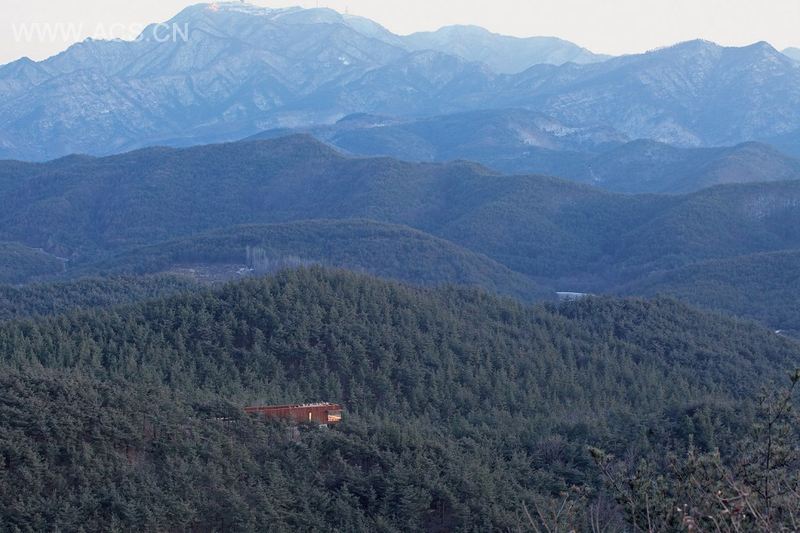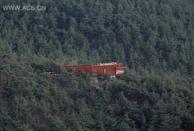 在韩国的大邱我曾设计过叫“某轩”的小房子和其美丽的庭院“史野园”,业主在这新的空间里享受着新的生活所带来的神秘气氛,同时业主也着手在军威地区的100万平米的山地里打造野生植物园的新规划。他用很长的时间种树、修剪并观察大自然的变化,后来这里需要住处,要盖这栋小房子。场地是在整个山势中可谓穴道之处,是中心要地,在此处映入眼帘的只是山和天空。因为朝向为西向,落日肯定是落到对面水库处,顺着地势放置的房子坐向,在入冬时应该与太阳的轨迹相同。
