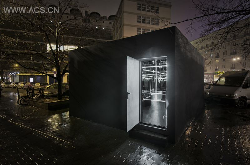 设计师面临的最大挑战是如何使用投资者提供的两个相互连接的集装箱办公室(体积大小是4.65 x 5.60 x 2.31m)。为了应对华沙每年这个时候的暴雨、大雪和严重霜冻(气温低至-20 ° C)等恶劣气候,保暖的金属制集装箱应需而生。另一个重要的任务是在“闪店”的入口制造惊喜。具体来说,就是赋予日常所见的小物件一种“爱丽丝梦游仙境的效果,引导顾客进入另一个世界。这个黑色立方体的外门面没有告诉我们店里都有些什么东西。设计师用黑色帆布紧紧罩住两个集装箱,看起来就像是一个魔术师的魔法箱子。27平方米的空间被划分为3个功能间,主要的展示区(4.5 x 4.5 m)、小个设备室和更衣间。空间的天花板非常低,只有2.2米高。为了避免顾客有种被局限在狭隘空间中的不快感,设计师决定把天花板和墙面都安装上镜子,大大拓展展示区的视觉空间。地板铺以黑色油毡。后面和更衣间的门都隐藏在镜子后面。更衣间两边都挂有黑布,顾客必须走出更衣间才能照镜子。设计师以LED照明的线条感强调所有内墙的边缘。LED照明是室内的唯一光源,和镜子的折射光一起,强化了空间的广阔感。
