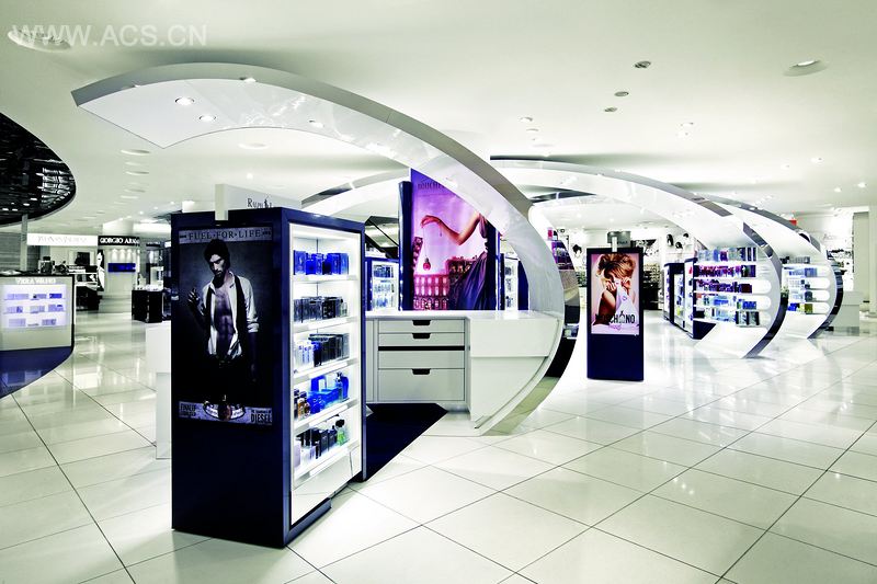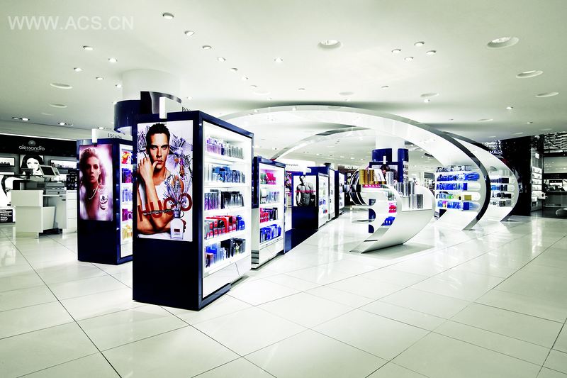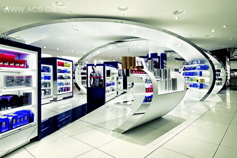 该店铺销售诸多国际品牌香水,它的可用空间在店铺中央,没有任何后墙,设计师想要找到一种三维的摆放香水的方式。最后,一个个货架勾勒出空间,巨大的螺旋在地板上延伸,并形成了一种边界。这些货架的外侧覆盖有上漆玻璃纤维壁纸,它们的颜色可以随着新装修或季节而改变。展示柜的色彩则与KaDeWe标志性的深蓝色相得益彰。本案独特的造型和色彩都营造了独特的新环境。