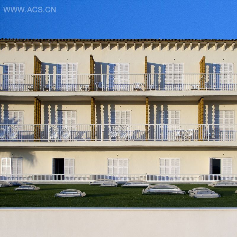 这个水池原来与酒店的后面相连,那里是一个被限制的荒废之地。这个项目的挑战不仅仅是阻止新领域作为次要功能被利用,而且能够保证使用他们能够凸显酒店朝气的外立面。现在已经竣工了,顶棚上点缀着窗户。这些相互影响的窗户洞洞在内部形成了一支美丽的灯光反射舞蹈,水池有了一个新的外立面和一个新的绿屋顶,上面装饰着一系列方形开口。