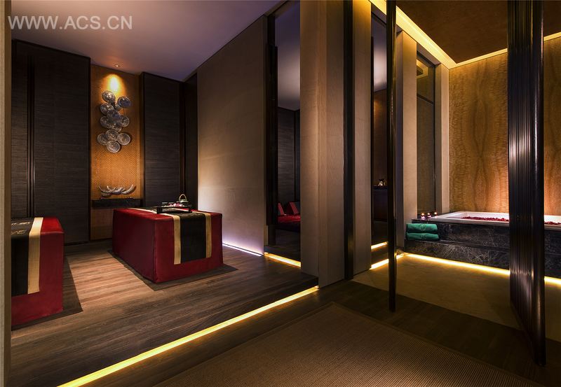 在天花板采用了简洁的水平线;金为主题的疗养室色调为经典的磨砂金;火为主题的疗养室展示了活力的红色色调;“木”房和“土”房则为舒缓的中性色调。