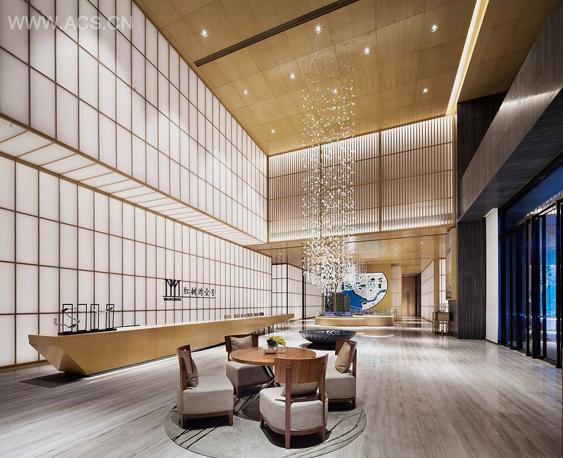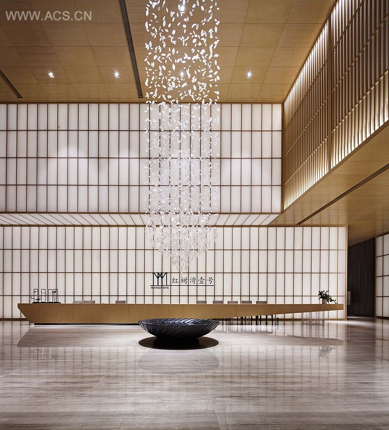 整个大厅区域与洽谈区结合起来,一条长桌贯穿整个空间,以其巨大的仪式感,升华了整个空间的气场,使人们在空旷静谧的空间中,感受到敬意和尊重。同时大厅高层的挑高,浅木色格栅与白色亚克力嵌入其中,在墙面上所形成的巨大体量感,以及垂挂于大厅中心的水晶挂饰与精致的黑色塘池,相互呼应,犹如清泉之水天上来,寓以聚财之意。