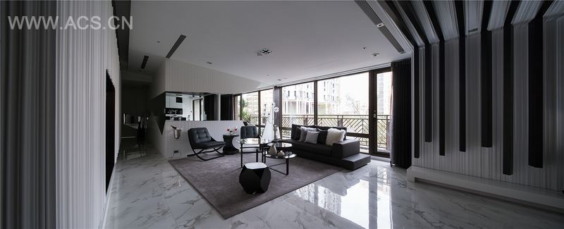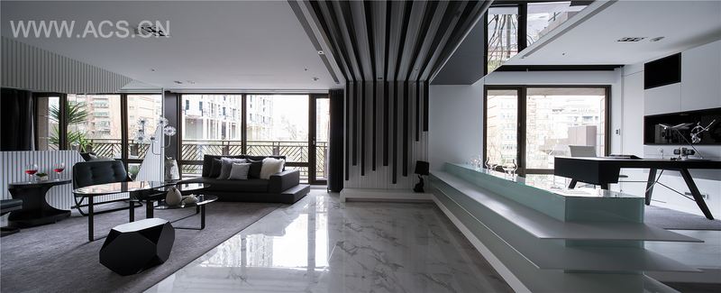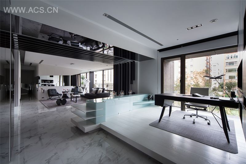 一旦跨入浮线形构的无际精彩中,迎面而来的天光和树梢,体现了层峰住宅所拥有的无价风景。开门即景的悬浮铁件线条,以视觉微距之差和艺术线板交叠成景,突破立面伸展至天际,由窄渐宽的线条扭转出雕塑工艺感,律动中创造充满戏剧张力的画面。半高的玻璃划分场域,底部人造石平台无缝串接至架高书房,无形中开阔了视野广度;而仿似从发光体穿透而出的铁件,极致轻薄的形与质,与玻璃形成一种强烈对比,于层层光滟里展开冲突对话,演绎独特的结构美感。