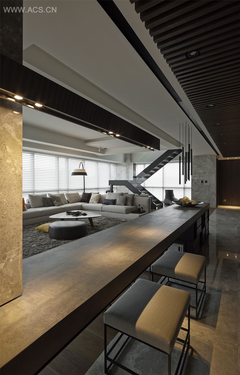 基地特性为一具备落地玻璃维幕外墙的三面采光空间。在此一空间优势下,利用垂直延展至天花的深色格栅,做为调和空间的一种反向张力。在垂直律动的节奏中,除了于表面反映日照,也利用立面进退处理的手法,使得墙体于不同视角具备了轻画的线条感、厚实的量体效果和跨尺度的水平桌面。一方面界定了场域分属和金属材质的半反射质感,同时也让纵向格栅的比例在视觉上获得平衡。