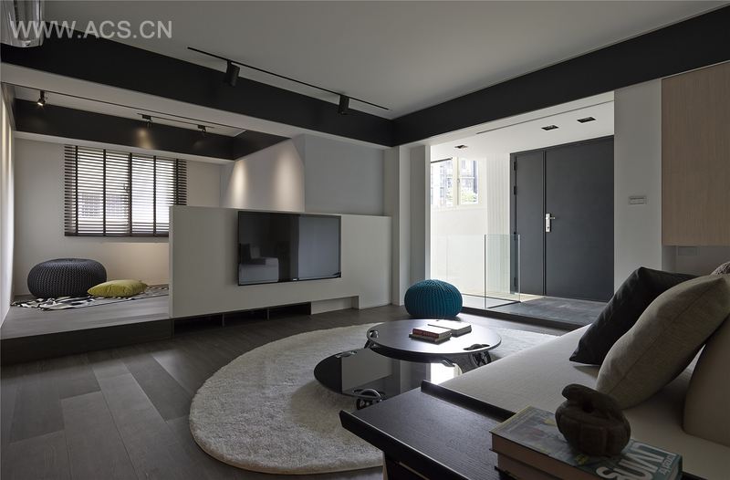 隐藏的十字轴线暗示空间的界定,座落在X轴上量体,围朔出生活场域,而Y轴上的量体相互组合,引导整空间序列。量体上的开放柜,重复上下错落,产生动与静的状态。