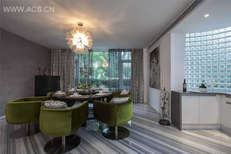 餐厅是家居生活的心脏,不仅要美观,更重要的是实用性、整体性。餐厅的灯光很重要,既不能太强又不能太弱,灯光则以温馨和暖的黄色为基调,顶部做了简单的吊顶。墙面贴了很柔软的壁纸,在餐桌的一侧加建出一个西式的餐厅,且采用玻璃材质来更好地融合室内外情境,也可以增加餐厅的情调。