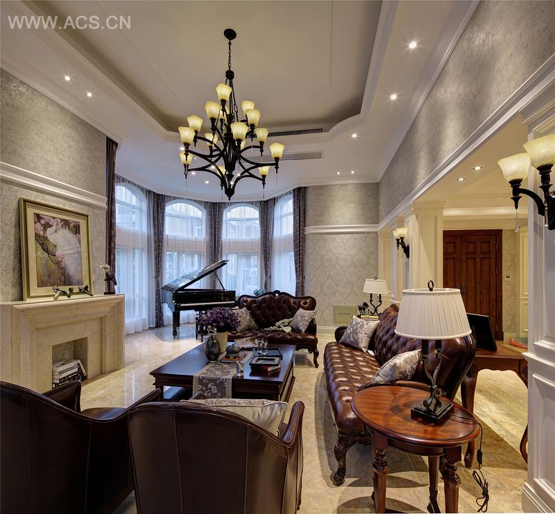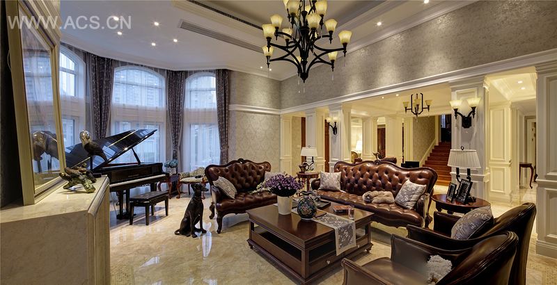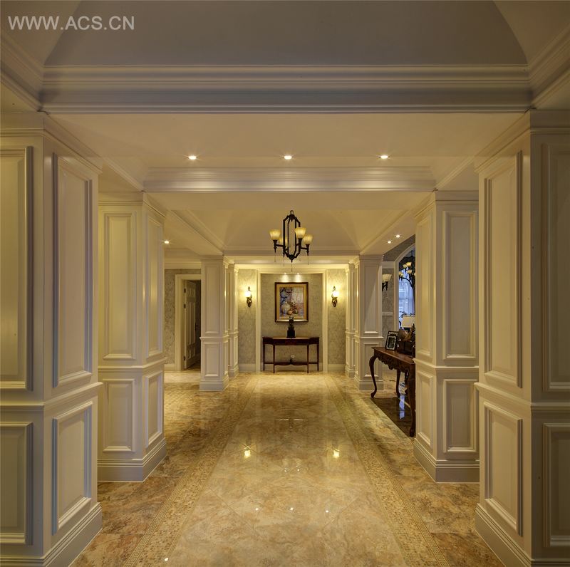 轴线关系的处理上,设计师剥离出处于门厅中的所有承重柱,以此为南北轴线划分出餐饮会客区与起居休息家政区几个部分,对称增补的柱子在内门厅形成整列,增强了本宅的气势。东西轴线以楼梯为中心让起居室中厅客厅串在同一轴线上,站在任意一端都能有层次地看到每个空间的对应关系。轴线的确定和柱阵的排列也使得动线关系自然流畅,大空间的主轴与小空间组团的辅轴线使得空间的布局更加合理化。西北角房间的拓展为中期客户另加部分,也强大了小空间内部的功能性。主卧室空间的合并和重组也使得主卧区域功能更加健全,舒适度得以很大地提升。