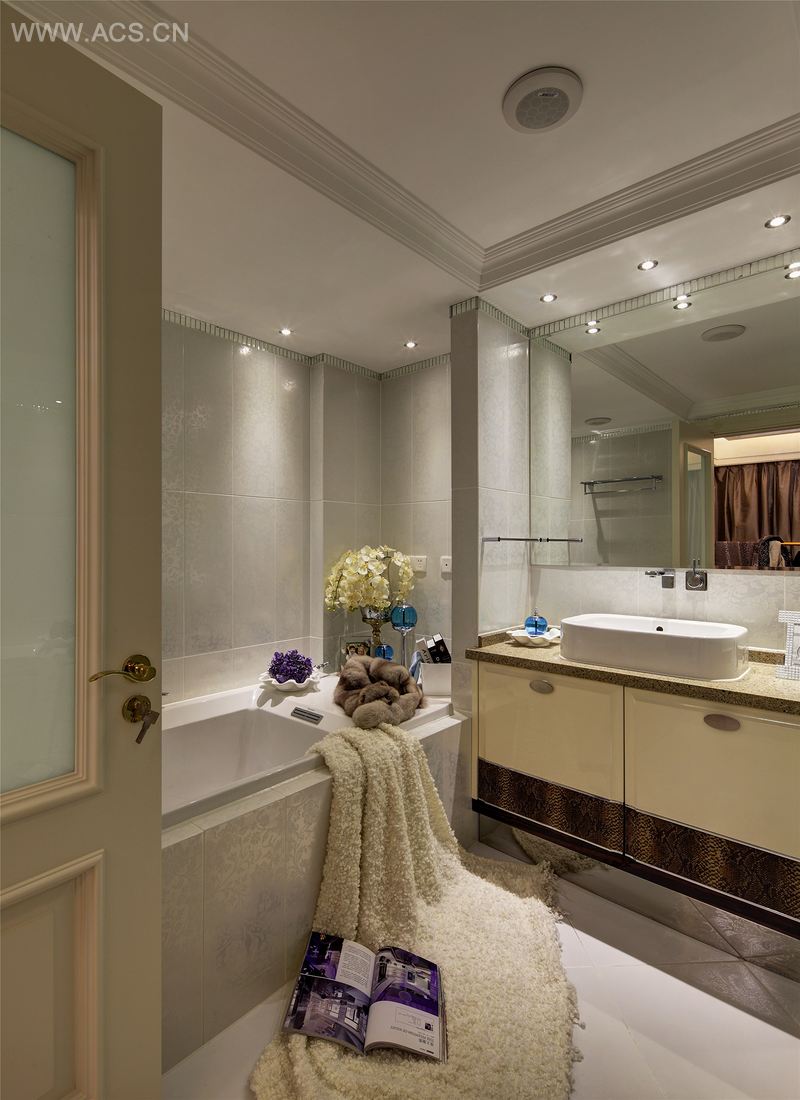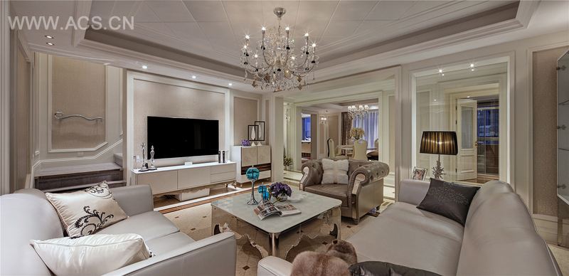 设计师选用了帕拉迪奥珍珠白木门,希望用浅色勾勒出整个空间的层次,帕拉迪奥线条优雅,因此在配套的石膏线踢脚线等线条选择上都奠定了以优雅来诠释空间的基调。带珠光的浅香槟色、淡紫色、银灰色、卡布奇诺、淡绿色诠释了奢华、内敛、优雅的室内环境,也融合了每个空间所有者的需求。通透的水晶灯使得空间更加通彻纯净,卡其色、珠光白的家具在这些色彩的映衬下和谐融入,咖啡色和淡米色微晶石的搭配让空间轮廓清晰,通透性再次得以提升,图兰朵高光的烤漆面和奢华的蟒皮都与墙地面材料和谐同在,丝质同色绣花窗帘将延续这一轻盈、纯净、优雅的主题。