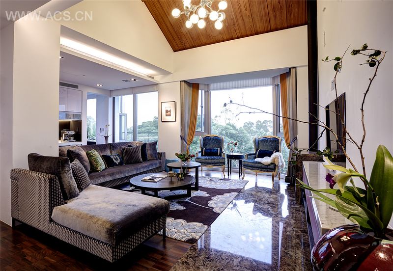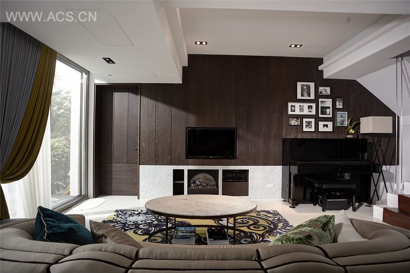 室内盈满醉人的淡黄色灯光,富有东方意境的牡丹织毯,以深紫与水蓝交织出律动感,让古典纹理变得活色生香,二者相配,展现东西文化的融通。家具以鸽灰色沙发、墨绿色抱枕,无雕饰木桌上置绽开繁花,呈现静定、安稳氛围,为免空间过于素净,特以纯白壁面与跳色窗帘提升质感,落地窗边放置两张古典座椅,金边雕花、弯曲椅角,上置乳白毛皮,使现代风格与贵族古韵融为一体。柚木装修的斜屋顶,体现了英式住宅的古韵,既维持阁楼的挑高感,利用大量木质与纯白壁面,消弭幽暗恐怖的传统印象。上开天窗,凭任日光缓缓洒入,角落里,一张鲜红沙发呈现设计者“不按牌理出牌”的童心,亦服膺空间配置的总体考虑,顺着楼梯下行,将梯厅原有大窗全数封闭,沉稳的深色壁面余两扇小窗,维持独栋建筑的私密性;钢铁支架渐次开展一如光束,一只精致钢梯悬吊其间,选用暗红木色与纯白的色彩组合,呈现屋主对于“机械美学”的高度掌握,亦显露秾纤合度的现代感。