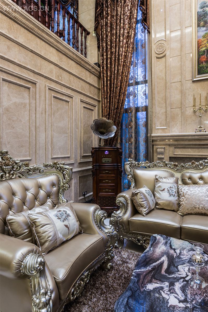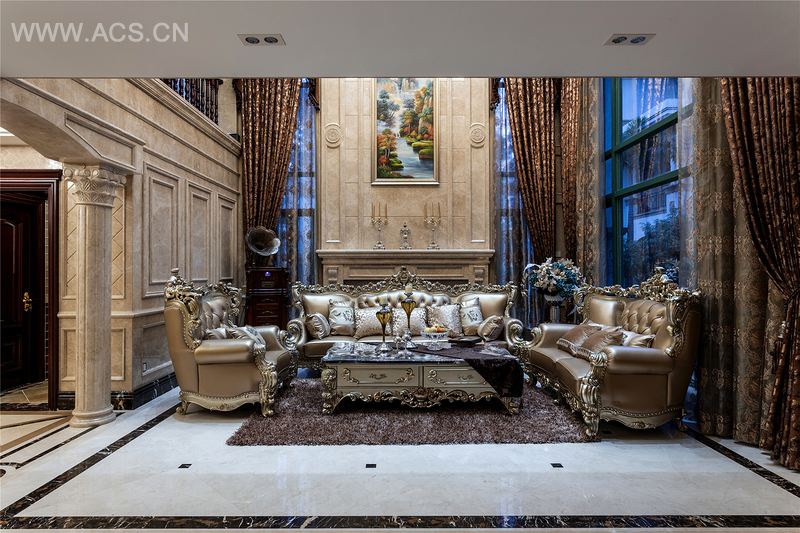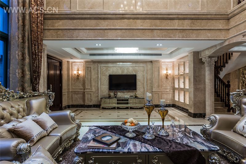 本案以奢华高雅的欧式风格设计,空间界面呈现出丰富变化,既有立体感,又有一种浓厚的奢华表情。魅惑华丽的吊灯和射灯映照下,堆砌出焕然一新的视觉美态。典雅奢华、美轮美奂。特别是大面积天然石材墙面护墙板的运用使空间显得更加奢华绚丽,使整个居室充满灵性和浓郁的贵族气息。