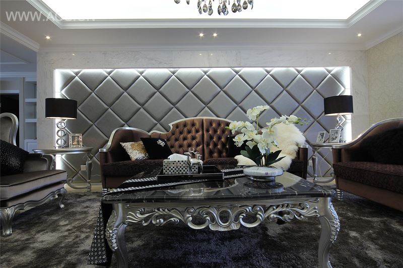 沙发中棕色的使用,使女性感觉十足的家居看起来多了一份男人的开怀硬朗。电视背景墙银镜的嵌入,以及爵士白石材的边框融入了些许的现代简约元素。而这些新的变化,既不显得生硬,又提升了品位,彰显了时尚。