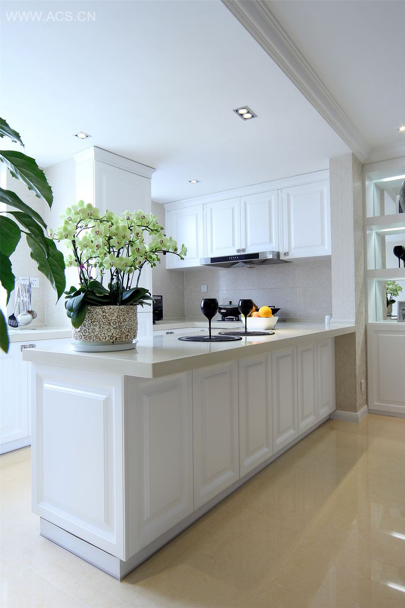 本案原有的客厅较小,而客厅的观景阳台窄小而不好用,厨房的狭窄也会在日后的生活中带来诸多不便。设计师将客厅观景阳台打通,扩大了空间,光线也更足了,还增加了独立的茶室。厨房改为开放式,把原厨房边上的小房间打通,和厨房融为一体,扩大了厨房的使用空间,这都给日后的使用提供方便。主卧占据了较大的面积,有独立的更衣间和较大的卫生间,给主人较多的私密空间。