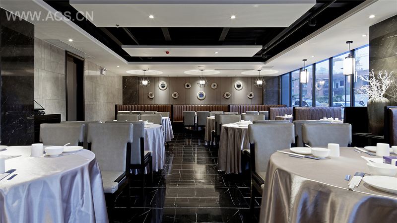 整体硬装设计手法简洁,墙面主要用了浅色的釉面砖和深色的拿铁灰大理石相融相间,墙砖铺贴的形态很具有设计韵律感,强调作为新派川菜的兰亭序在大气之外的出品精致与细腻。软装饰品方面,以点到为止,如一楼就餐区的大厅正面墙上,则用九个大小不一的圆形挂饰,具有很强的视觉表现力,同时也与一楼大厅整体圆桌相互应,柱子旁则用了白色干枝,不知不觉中丰富柔化了空间。在这样的就餐环境下,相信每个人的味觉都有了更大的想象空间。