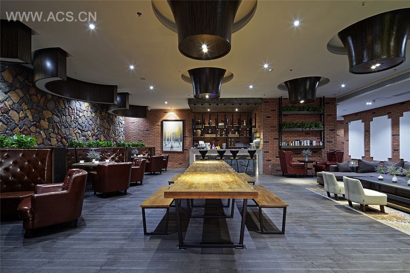 休闲处是本案设计的着重之处,设有咖啡吧,半私密的弧形洽谈区,长木互动桌,沙发休闲区,还有小吊书架下的二人洽谈椅等等,这些无不彰显联合办公的开放,互动,趣味,休闲融为一体的办公特质,最终为创业者提供相互交流,资源整合,实现共赢。