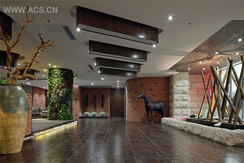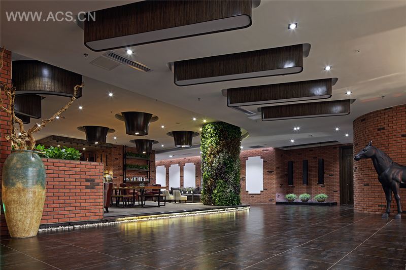 在设计视觉形态上,采用了红砖为基调贯穿全场,辅以白色造形和红砖形成序列关系,融入了绿植相间其中,简洁,创意,有韵味。营造洽谈气氛的水景和创意视觉的干竹互融互生,相得益彰,又和旁边硬朗的蘑菇石构成和谐关系,重轻有度,虚实有别,维妙维肖。