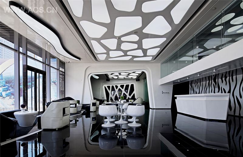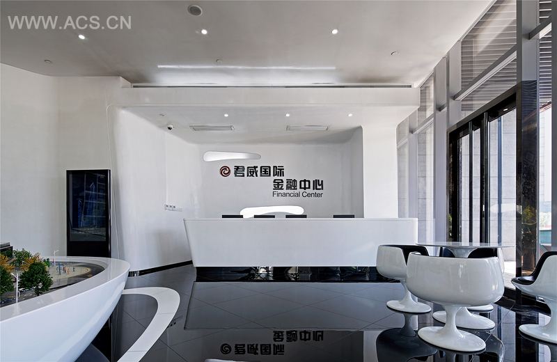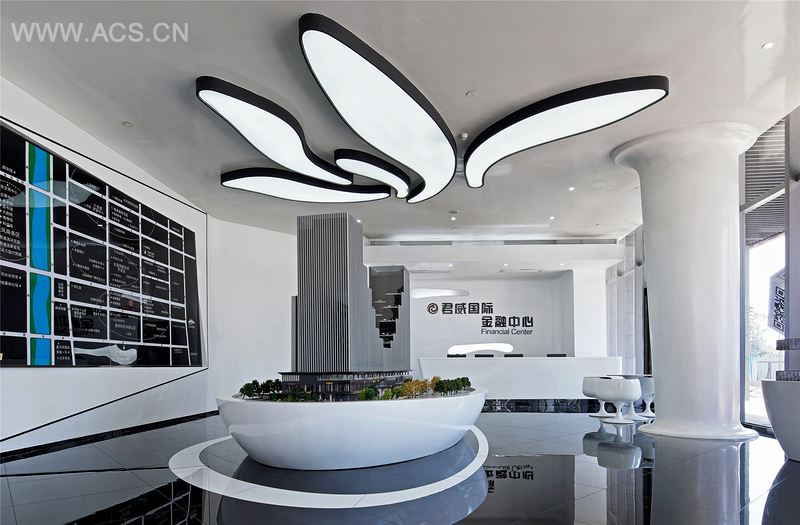 在设计风格上,售楼处设计谐同建筑设计思路,采用现代手法演绎,以白色为主调,辅以黑色,整个空间流线型极强,无形当中增大了视觉冲击力。