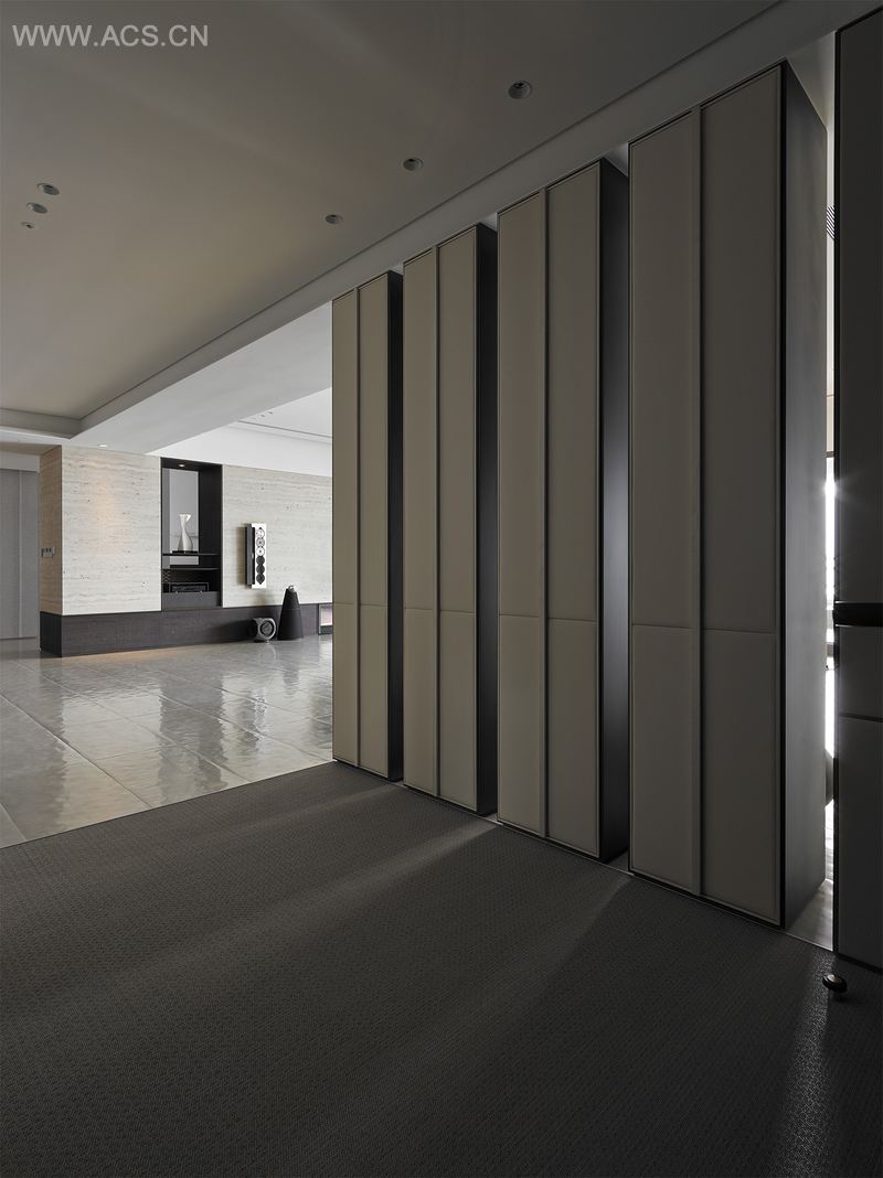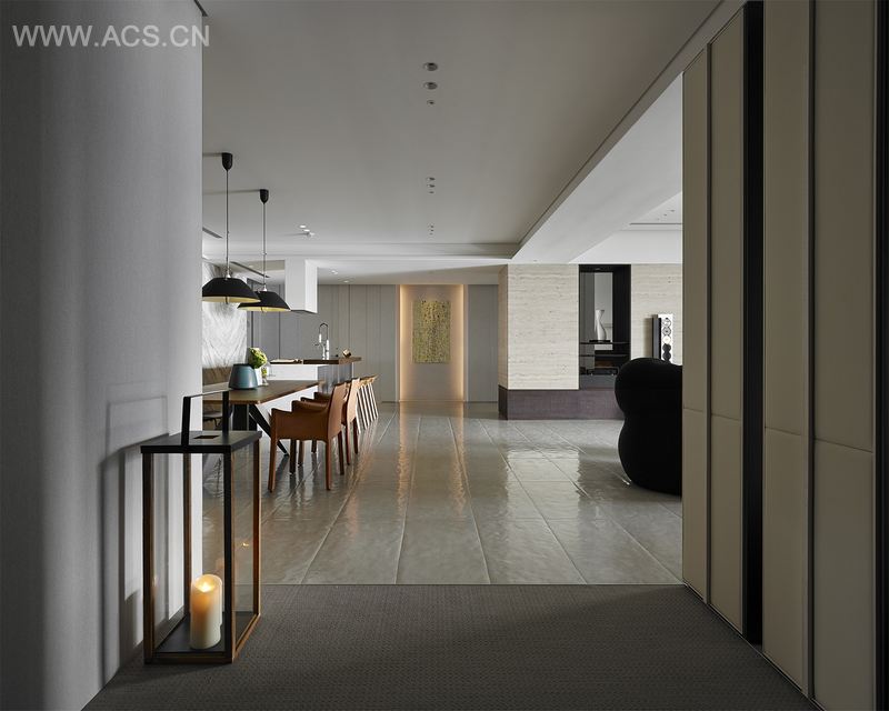 此栋位于淡水的名宅特色是一户一泳池,远眺观音山淡水河出海口,在表现这样池景河景甚至海景的住宅精神下,我们希望将淡水夕照下水面波光粼粼的印象延续至室内场景,因此空间中主要大面积呈现场域精神的地坪以意大利memento仿旧复古砖,手工不平整的仿石纹立体面造就其波光明净的效果。作为一个渡假住宅,时间也是相当有魔力的,一切的行为与心境皆慢了,虽然同样运行于一个时空,却产生如时间膨胀的错觉。