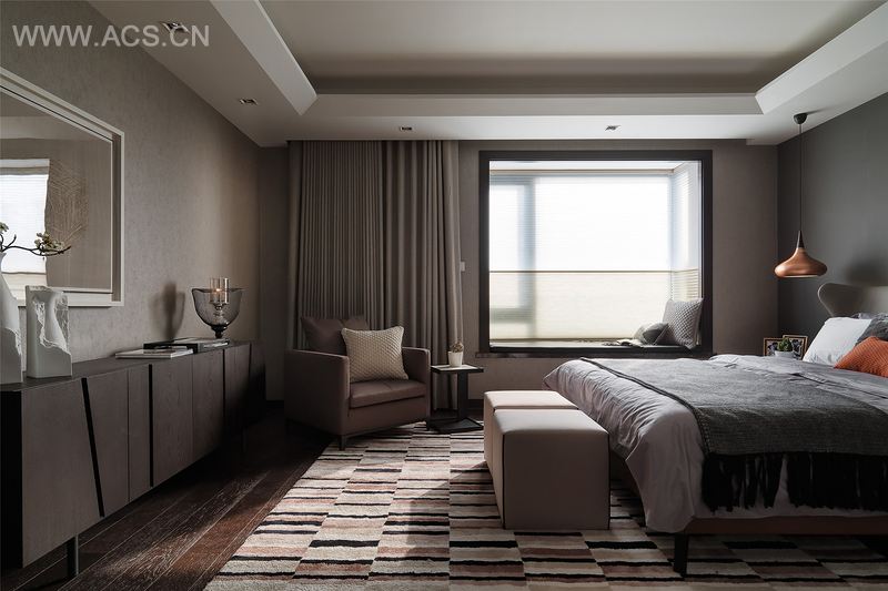 拾级而上进入私领域,延续公共空间充满东方禅意的木质调用色,