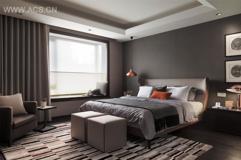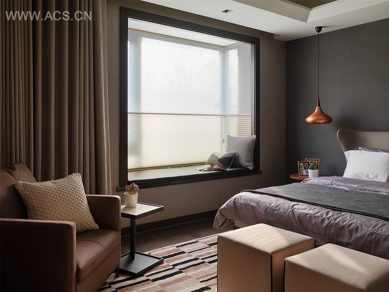 沉稳内敛的窗框色彩,勾勒出空间线条,刻意搭配略带暖意的壁纸,柔化阳刚冷调的用色,营造居家温馨气氛。