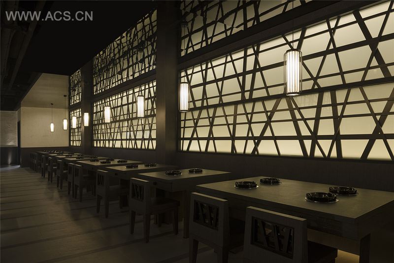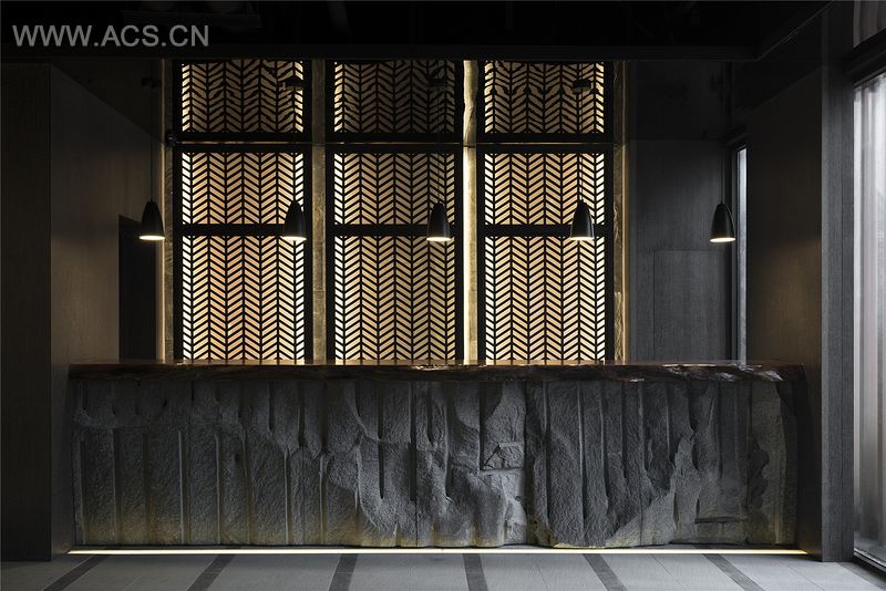 一楼柜台以凿面石皮佐以原木台面,搭配后墙中式窗花发想,产生粗旷与细致的和谐对比。空间居中设置循环景池,边缘藉光带将池体与地坪脱开,呈现轻盈漂浮感。上方天花板使用黑烤玻璃面,嵌以量取胜的木构件群落,造就仰角视野「数大便是美」的磅礡。环绕景池排序的卡座群,造型朴雅,后衬玻璃投光于墙面与卡座,以错落格栅诠释剪影艺术。