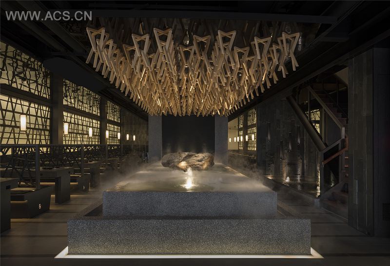 二楼延续景池开场,室内天顶缜密排列巨大波型格栅,气象万千的凝态流体型塑奇幻异次元。全案揉合特色素材与现代手法解译抽象禅风,演绎全新感官体验。
