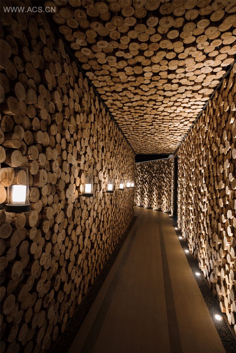 空间的挑高也是此案一大优势,跟着仰角视线往上,两侧墙面以老木排列堆栈,诠释老旧但温暖的时间感,木头的肌理在灯光微波下别有一番刀劈斧凿的粗犷。二楼衔接两侧用餐区的回廊以大量原木剖面贴覆,造型面的高低差,彰显木头天生的纯朴与香气,地面的线条与墙面的壁灯,适度在奇幻的时空里完成动线引导。精神面的丰饶加上多种风情元素群聚的气势,让「天水玥」与众不同的情境氛围,恒久沉浸在由古老东方美学浓缩后的结晶状态。