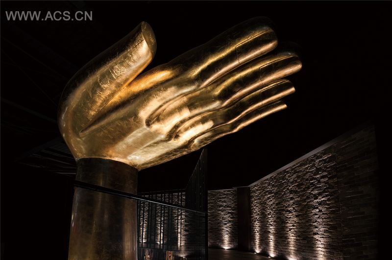 推开镂刻云纹的木雕大门,两侧巨大的描金佛手擎天而立,向上托撑的手势相当摄人,彷佛要推开刷黑的屋顶,也是最吸引来客打卡上传的景点。沿着直行视线向前,尽头处高达七米的立体佛头雕塑垂目浅笑,在底部光源烘托下刻划分明层次,佛首的下巴处恰好悬浮于迷离水雾之上,唇角上扬的弧线散发慈爱庄严的神韵,让躁动人心备感安稳妥贴。特别是佛头与佛手之间,以一座长矩形镜面水景串连,灰阶抿石子砌成的基座两侧内嵌投射灯光,与悬浮于水面两列手作玻璃烛灯共构梦幻光影,时时并有氤氲的水雾腾绕其间,和天顶垂挂而下的线香装置相映成趣。