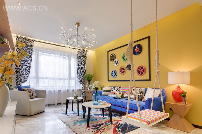 黄色墙面蓝色沙发,再加上红色台灯的点缀也不显得落俗,仿佛告诉居住者,生活中不必刻意躲避摩擦,有时大胆一些的碰撞会擦出意想不到的火花。