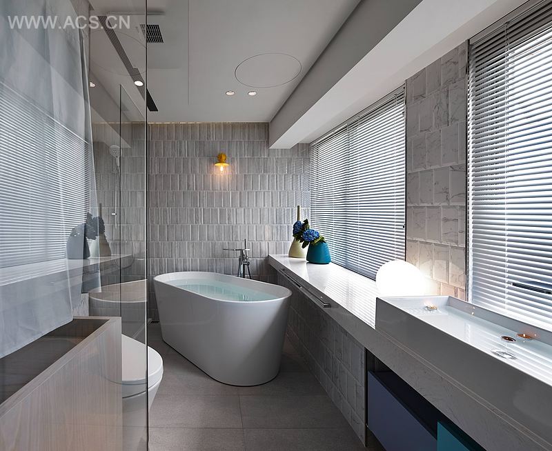 靈感擷取時尚插畫大師Rene Gruau之作,反映著法式用彩之活潑大膽,成為空間色調的摘取。溫暖橘色書房、靜謐藍客廳與華貴金色廚房彼此相搭相應,以鮮顏重彩、大面積體的色塊律動及幾何拼接趣味,與線性裝飾搭配起優雅韻味。如不對稱之時尚解構,餐桌桌腳訂製如縫紉機具,打破經典平衡的衝突,相襯服裝設計潮流的實驗派性質。