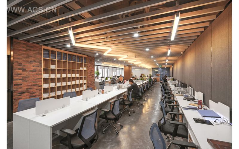 开放办公区地面时水泥密封固化的,硬度高,容易清洗,经久耐用又不失时尚。墙面采用灰色的硬包和磁吸玻璃墙和文化石墙面形成质感和色彩的对比。