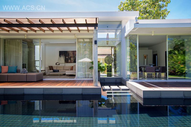 推开滑动玻璃门,宽敞的生活和卧室空间便与热带环境融为一体,门外茂盛整齐的草坪上躺着12米水池,池内镶有黑色瓷砖。