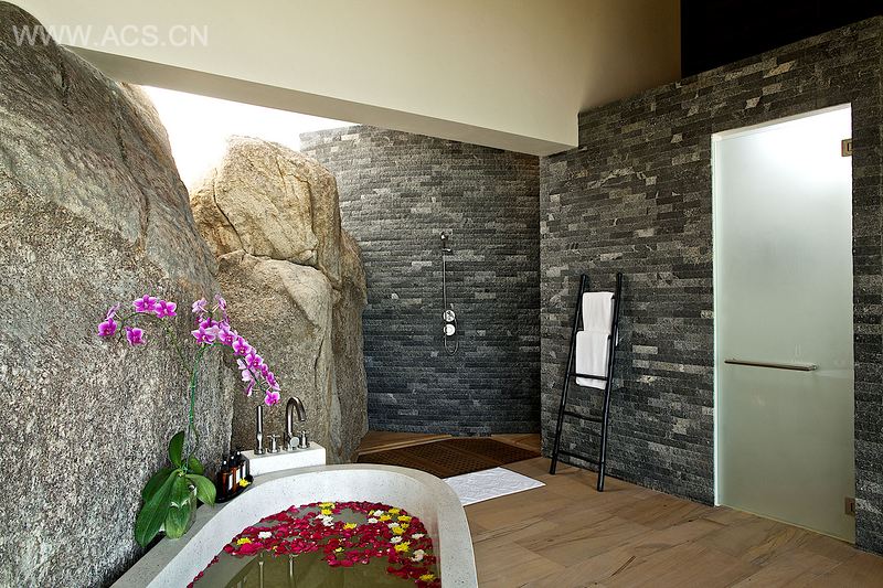 该五房建筑因其惊人的结构而出名,别墅还设有大游泳池、休息大厅和独特户外电影区。标志性的屋顶结构主导着建筑主题:用杉木瓦覆盖,陡峭的屋顶给主生活区提供了充裕的空间,高达10米,而卧室区的屋顶变矮了,显得更加亲密。浴室和户外沐浴空间中的天然岩石给整个质朴的室内空间增添了自然笔触,实在令人赞叹。儿童卧室中高大的玻璃墙是又一个亮点,透过玻璃墙便是泳池——模拟的水族馆。