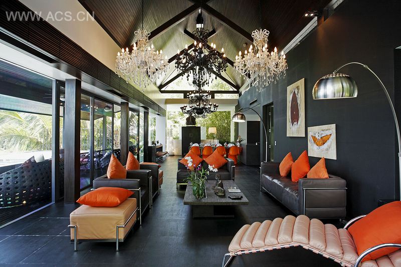 柔和线条的经典泰式设计与线条清晰生硬的现代设计相结合,再配上奢华的装饰,组成了精致的“阳”别墅。暗色硬木阶梯板、大理石和花岗岩等光滑的材料突出了贯穿别墅的独特设计语言:玻璃板盥洗台、镶有卵石的竹框浴室隔板、彩色串珠浴缸和玻璃楼梯。
