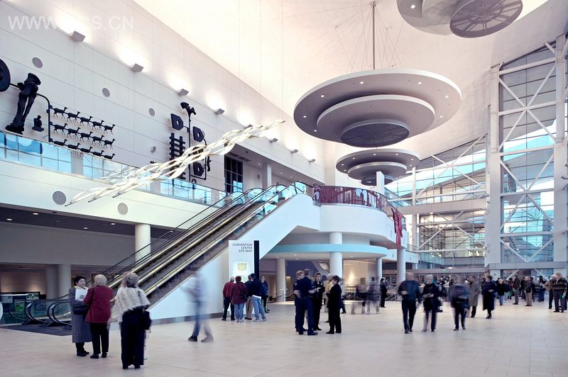 Fentress巧妙地把新的不锈钢覆表面和全景观玻璃幕墙融入旧的会展中心。金属片戏剧性地悬臂式伸出,在保护室内不被烈日所晒的同时,欢迎游客访问和允许朝上的灯光,使地平线上高耸的建筑具有光泽感。