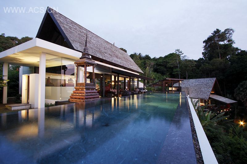 该别墅共由五座泰式亭楼组成。它们分别是入口亭楼、客房亭楼、户外亭楼、主亭楼以及主卧亭楼。它们由小径相连,又从设计上被分隔开来。一处隐蔽的石梯从崖壁泳池通向海边的天然浅水池。