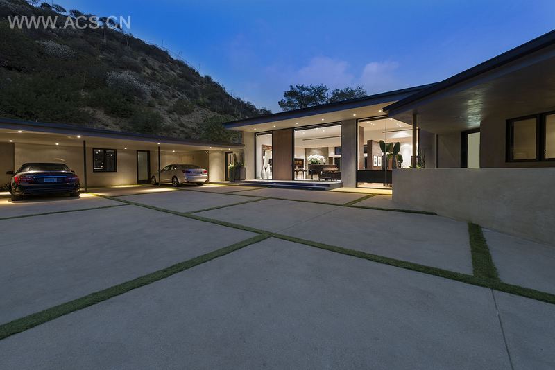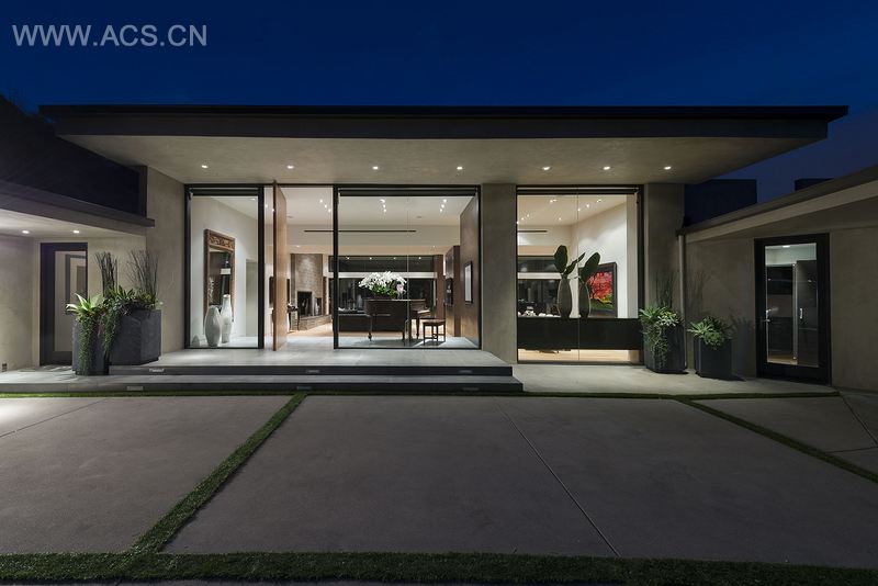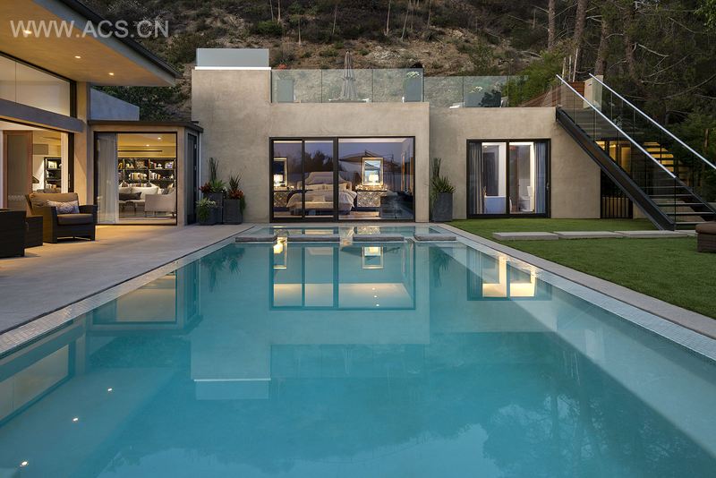 经过对内部结构重新设计,房屋内部布置开放,同时还有高高的天花板和平坦的屋顶。宽宽的正门两侧都是玻璃墙,使得屋内布置一目了然,一架钢琴正好摆放在这个完美舞台中。透过12英尺玻璃幕墙和8英尺滑动玻璃折叠门,就可看到屋外的露台和水池。