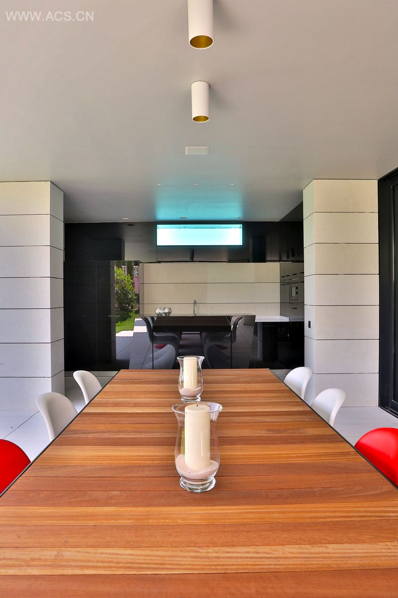 地下室包括储藏室、杂物间、酒窖以及大型健身房。健身房的游乐区与走廊相连,推开推拉窗,走廊又与花园相通。走廊也可用作就餐区、烧烤和室外厨房,并把水池和顶层连接起来。